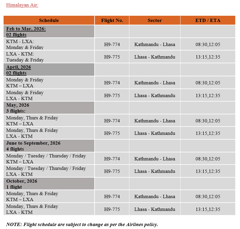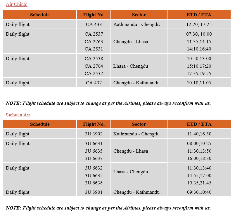 Flight Schedule to Tibet